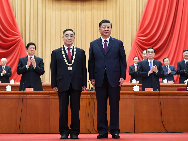 栗戰(zhàn)書宣讀習(xí)近平簽署的中華人民共和國主席令。主席令指出,為了隆重表彰在抗擊新冠肺炎疫情斗爭(zhēng)中作出杰出貢獻(xiàn)的功勛模范人物,弘揚(yáng)他們忠誠、擔(dān)當(dāng)、奉獻(xiàn)的崇高品質(zhì),根據(jù)第十三屆全國人民代表大會(huì)常務(wù)委員會(huì)第二十一次會(huì)議的決定,授予鐘南山“共和國勛章”,授予張伯禮、張定宇、陳薇“人民英雄”國家榮譽(yù)稱號(hào)。