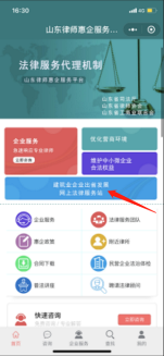 登錄方法:通過微信移動(dòng)端應(yīng)用程序掃描二維碼登錄“山東律師惠企服務(wù)平臺(tái)”小程序,在頁面進(jìn)入紅色箭頭所指的“建筑業(yè)企業(yè)出省發(fā)展網(wǎng)上法律服務(wù)站”欄目,可以直接聯(lián)系入庫(kù)律師事務(wù)所和律師進(jìn)行咨詢。(外聯(lián)站)